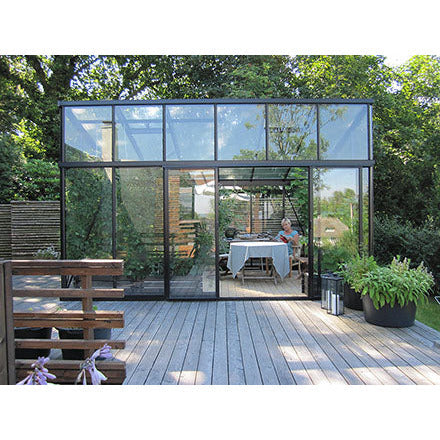 With its sleek design and modern sloping roof, this greenhouse provides a clean look. Perfect for use as a garden room in a modern villa. Also the ideal greenhouse to accommodate a lounge area together with a growing area.