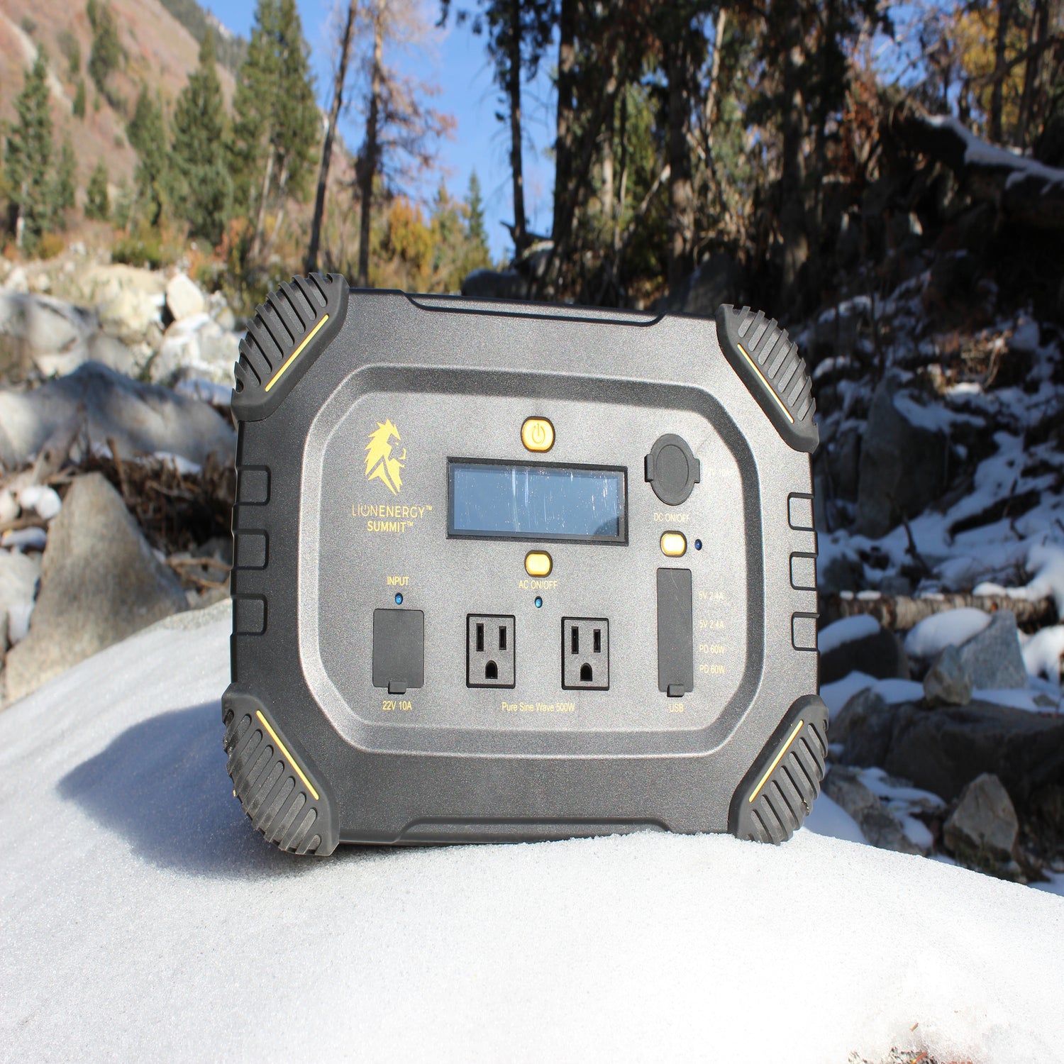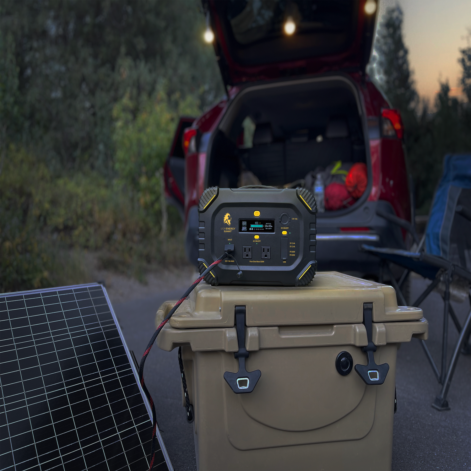 The Lion Energy Summit™ is a portable solar powered generator with 530W of output, multiple outlets and ports, and weighing only 18 lbs, you can have power at your fingertips, wherever you are. Charge your Summit anywhere with either a 50W or 100W solar panels and light your way with a USB-based LED light strand.