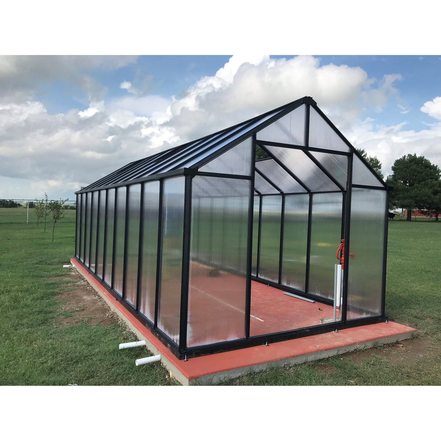 - Integrated flush base design; High impact UV stable 8mm twin-wall polycarbonate walls and roof; Heavy-duty extruded aluminum frame construction; Black electrostatically painted frame