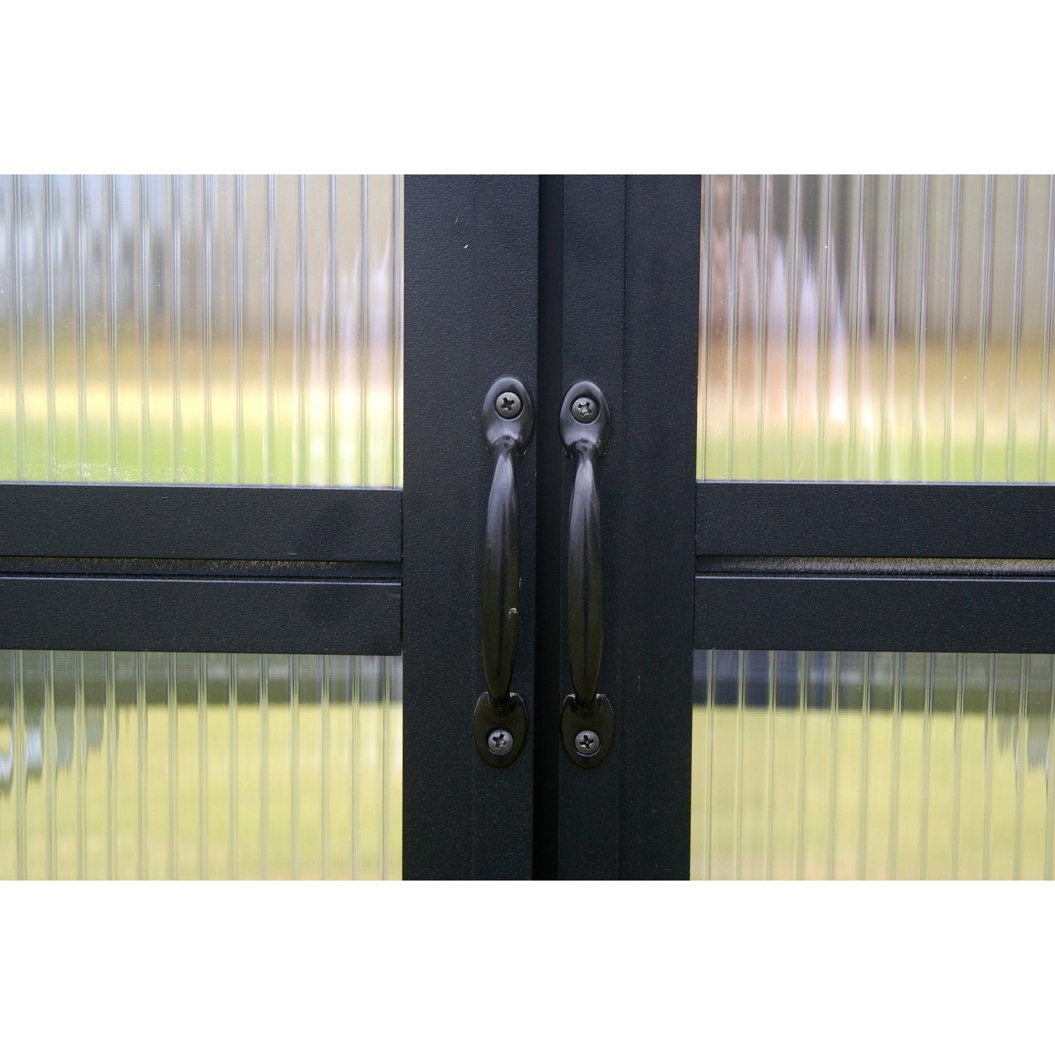 - Light Diffusing UV stable 8mm twin-wall polycarbonate walls and roof, Heavy duty extruded aluminum frame construction, Electrostatically Painted Black Frame