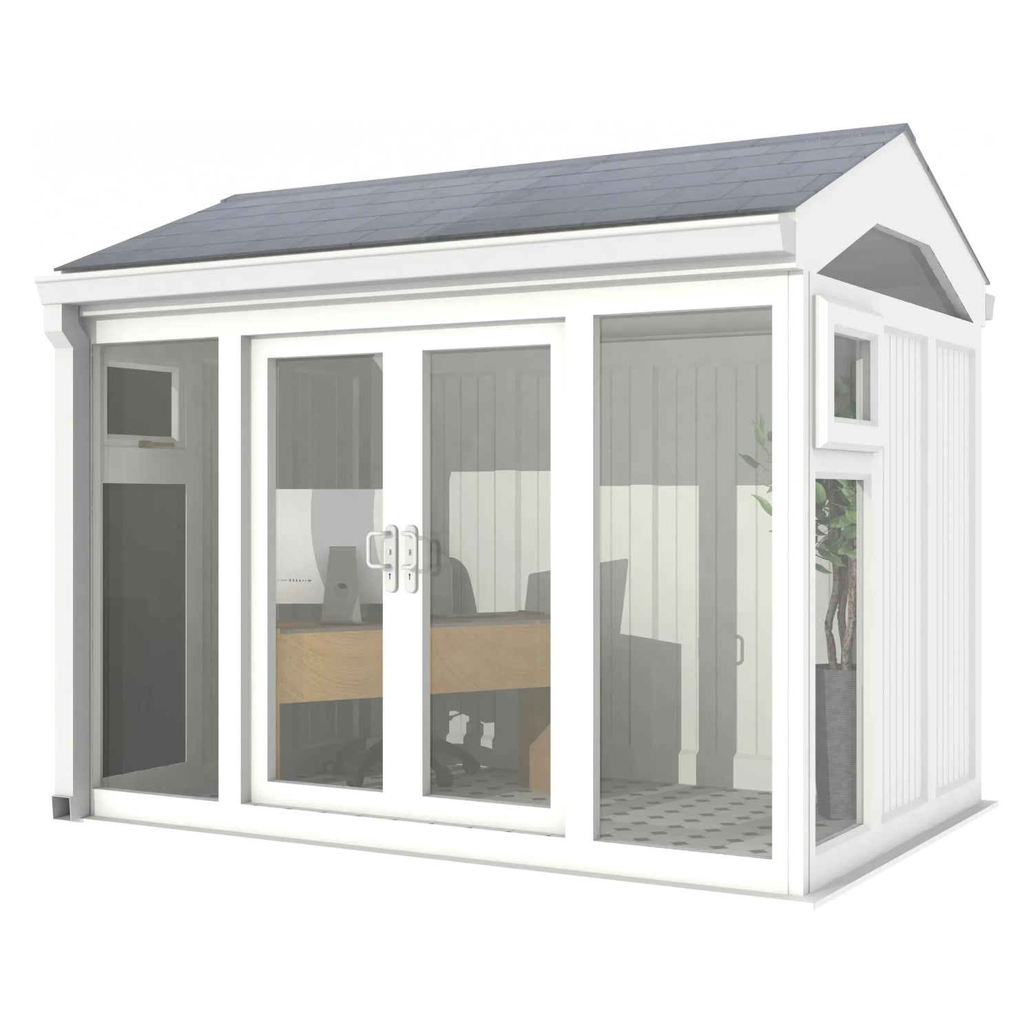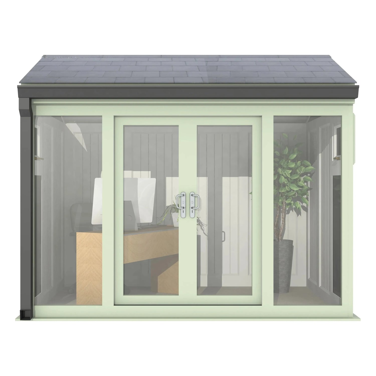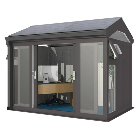 The Greenwich is a versatile 10' x 18' garden room with an integrated shed extension, offering functionality and style in one elegant design. With insulated and double-glazed panels, it ensures a comfortable environment throughout the year, whether used as a creative retreat, a home office, or for storage.