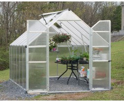 The Essence greenhouse kit makes it easy to regulate the temperature, humidity and airflow of your DIY greenhouse with two vent windows and makes it effortless to go in and out with arms full of trays or pushing a wheelbarrow with two wide doors and a low threshold. The essential greenhouse also includes a galvanized steel base and a built-in gutter system.