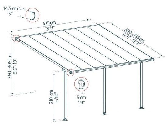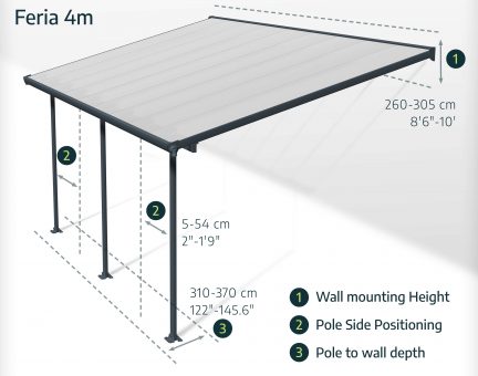 Enjoy warm days, cool nights, and everything in between under the extra-wide Feria Patio Cover. The Feria Patio Cover Kit is an attractive, maintenance-free roofing solution for various outdoor uses such as a patio cover, sun lounge, and carport. Protect your valuables from unpredictable weather and harmful UV rays with this high-performance structure. It features flexible positioning poles which enable you to set your required height at the wall connection, the distance from the house and between the poles at the front. It was designed to be simply assembled by 2 people, using the Click N’ Lock roofing system for safe and simple assembly, preventing leaks. It requires no experience, no special skills, and no special tools. The Feria Patio Awning provides your family with an elegant, beautifully crafted, sturdy addition to your outside living space that is sturdy and rust-free for many years to come.