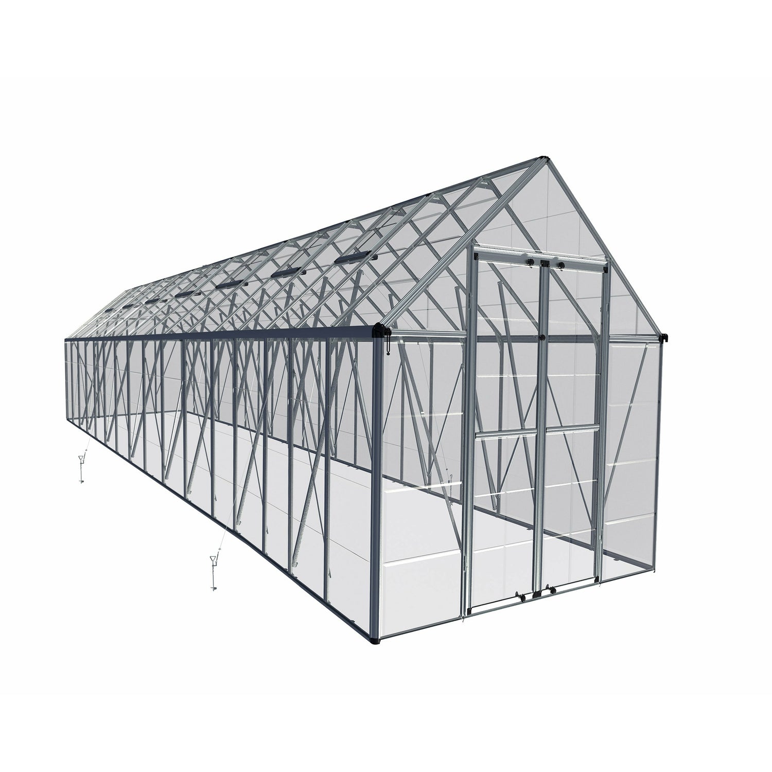 The Snap & Grow 8' x 32' Silver Frame Hobby Greenhouse features the SmartLock connector system. Heavy duty aluminum frames assemble easily without a lot of hardware. Crystal-clear SnapGlas panels slide right into the frame, lock into place and are virtually unbreakable. The 8’ wide greenhouse offers double hinged doors that allow easy access for your larger items and plants. Aluminum framework, clear single layer polycarbonate panels, swinging front doors, rain gutters and roof vents are standard features of the Snap & Grow. This greenhouse makes any backyard a sanctuary.
