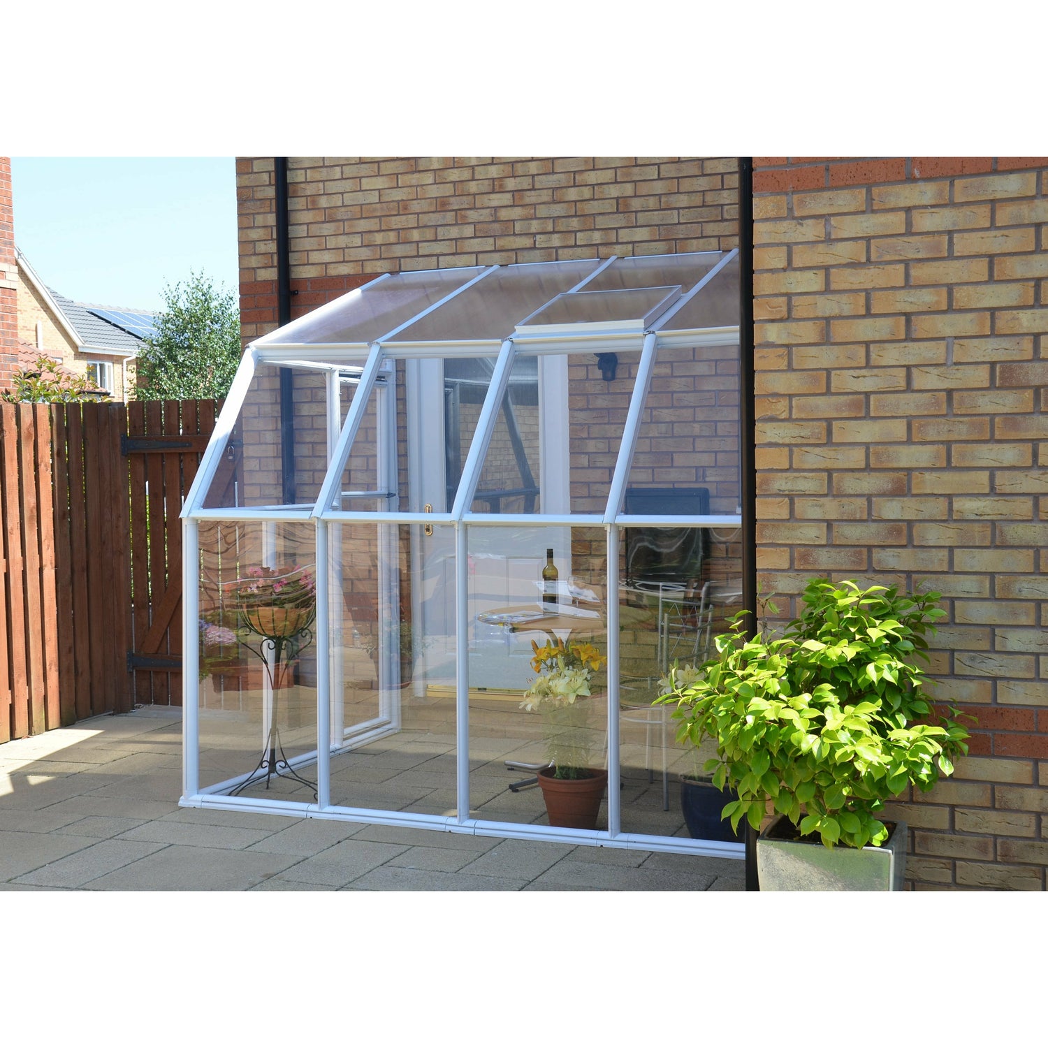 Discover the simplest way to turn your existing porch, deck or patio into a great sunroom enclosure or greenhouse space. The Sun Room 2 features two kinds of virtually unbreakable coverings to give you the best of both worlds. Roof panels are 4mm twin-wall polycarbonate, offering UV protection and diffuse light. Crystal clear acrylic side walls are 100% UV protected while allowing over 90% light transmission, as well as clear views, while being ultra-safe. Durable white resin frame improves insulation and is maintenance free for ease of use. Hinged door and included roof vent provide air circulation. Accessories and additional lengths available.